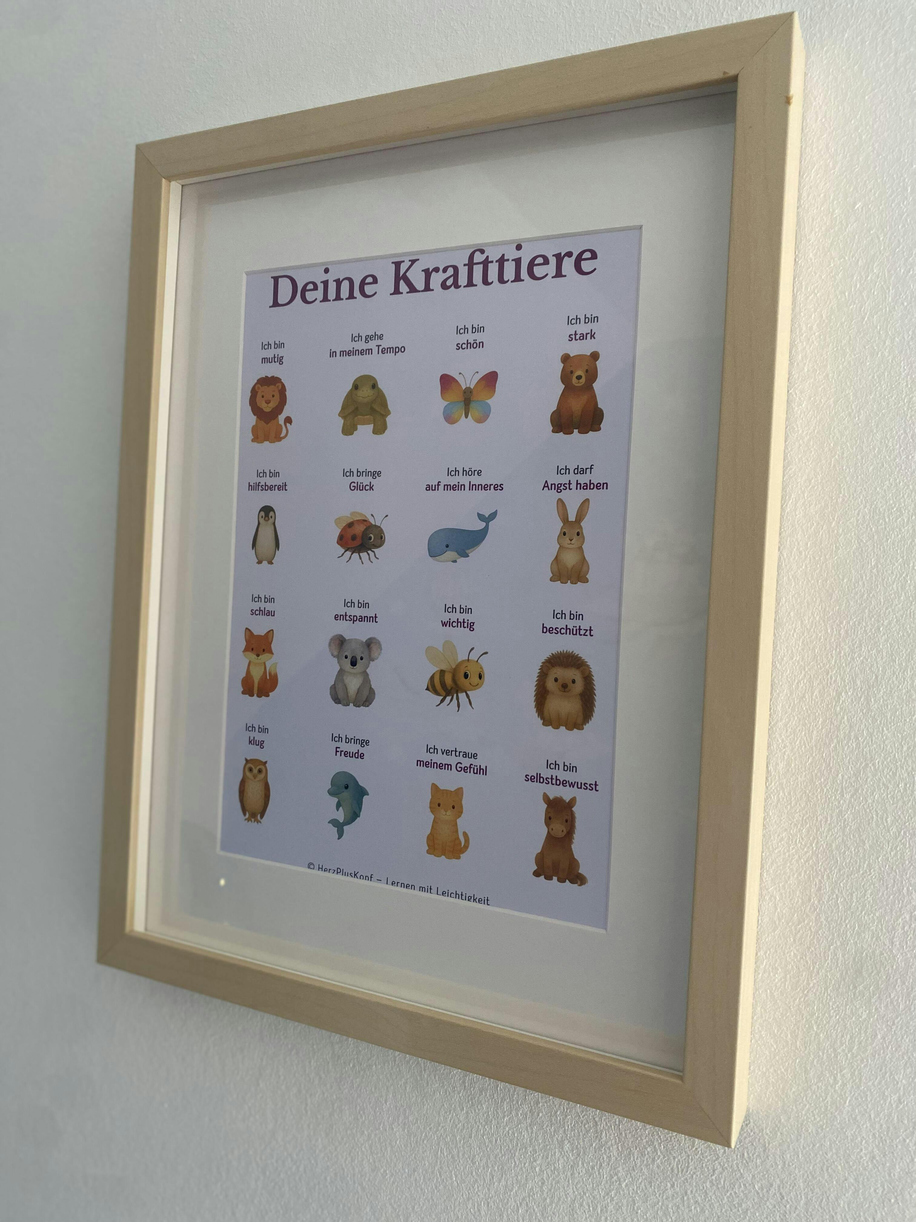 Dieses Poster ist eine herzliche Umarmung in Bildform. Deine Krafttiere erinnern Kinder – und uns Erwachsene – jeden Tag daran, wie viel Gutes bereits in uns steckt. Löwe, Schildkröte, Schmetterling, Bär und ihre Freundinnen flüstern stärkende Botschaften: Ich bin mutig. Ich gehe in meinem Tempo. Ich bin schön. Ich bin stark. Ich darf Angst haben. Ich höre auf mein Inneres. Ich bin wichtig. Ich bin beschützt. So wird aus einem liebevoll illustrierten Blickfang eine tägliche Portion Selbstwert, Achtsamkeit und Freude.
