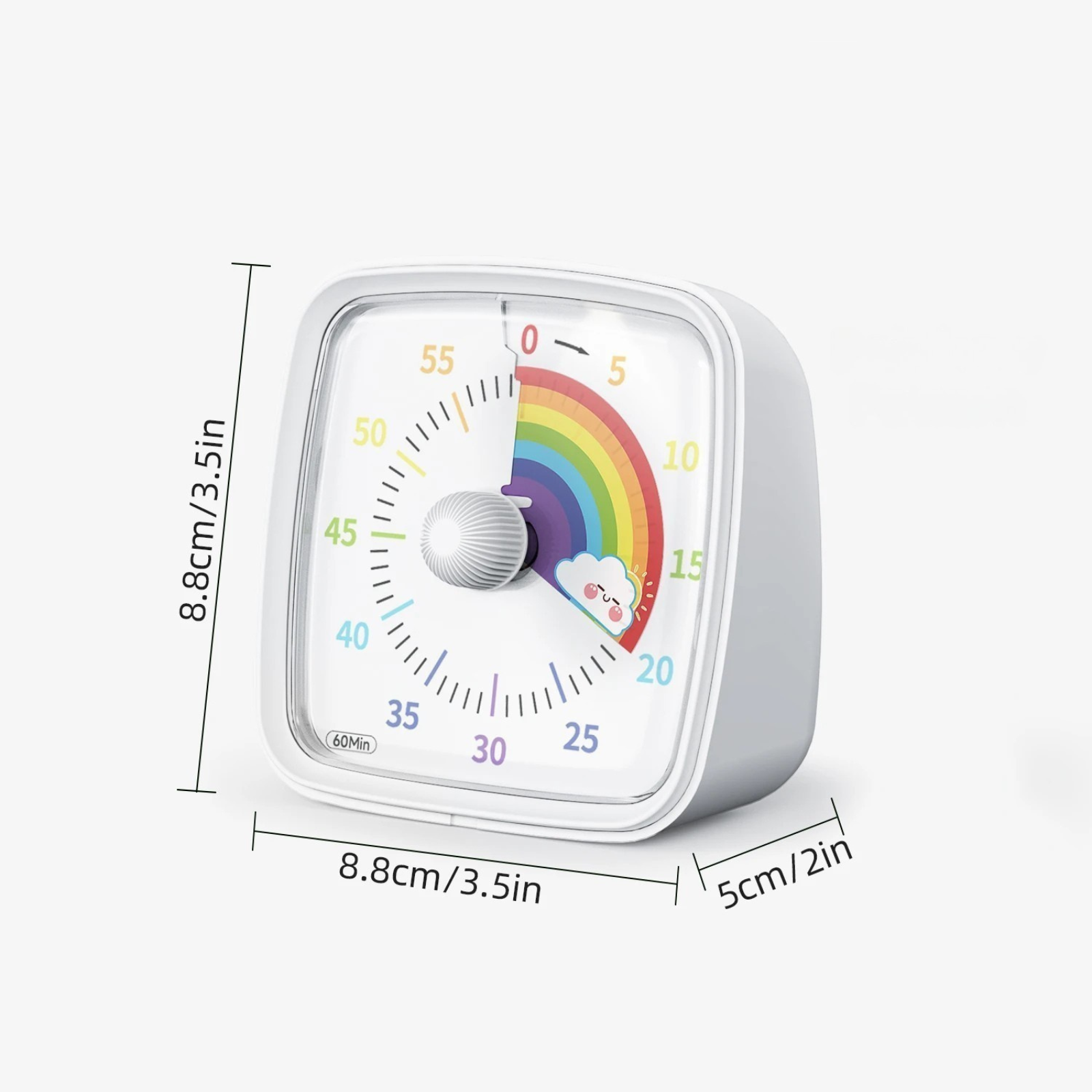 Der analoge 60‑Minuten‑Countdown zeigt lautlos den Rest der Arbeits‑ oder Spielzeit. Durch die großen Zahlen, die drehbare Front und die liebevollen Designs (Regenbogen, Einhorn, Dino) bleibt Zeitmanagement intuitiv – im Klassenzimmer, am Schreibtisch oder beim Zähneputzen.